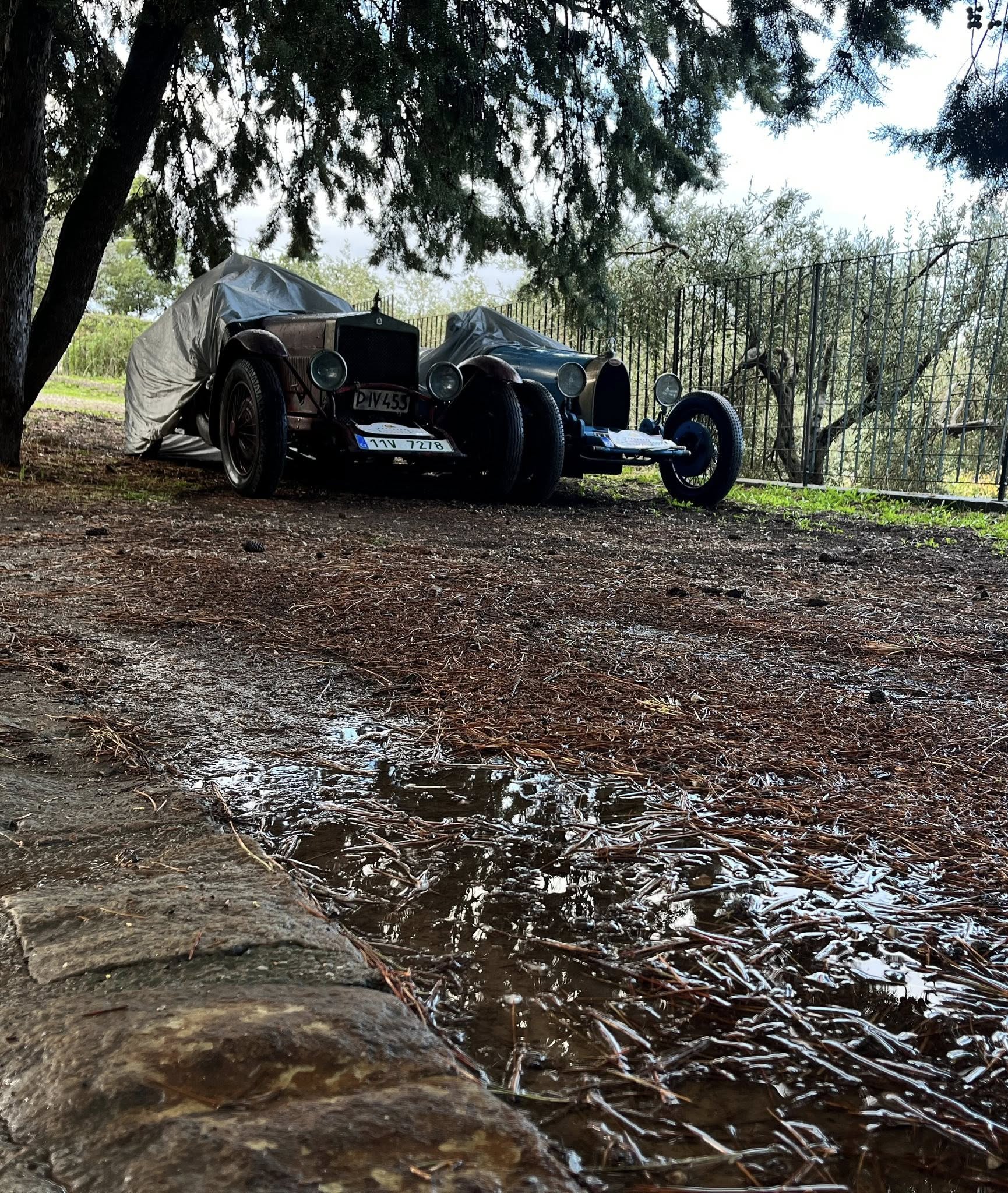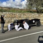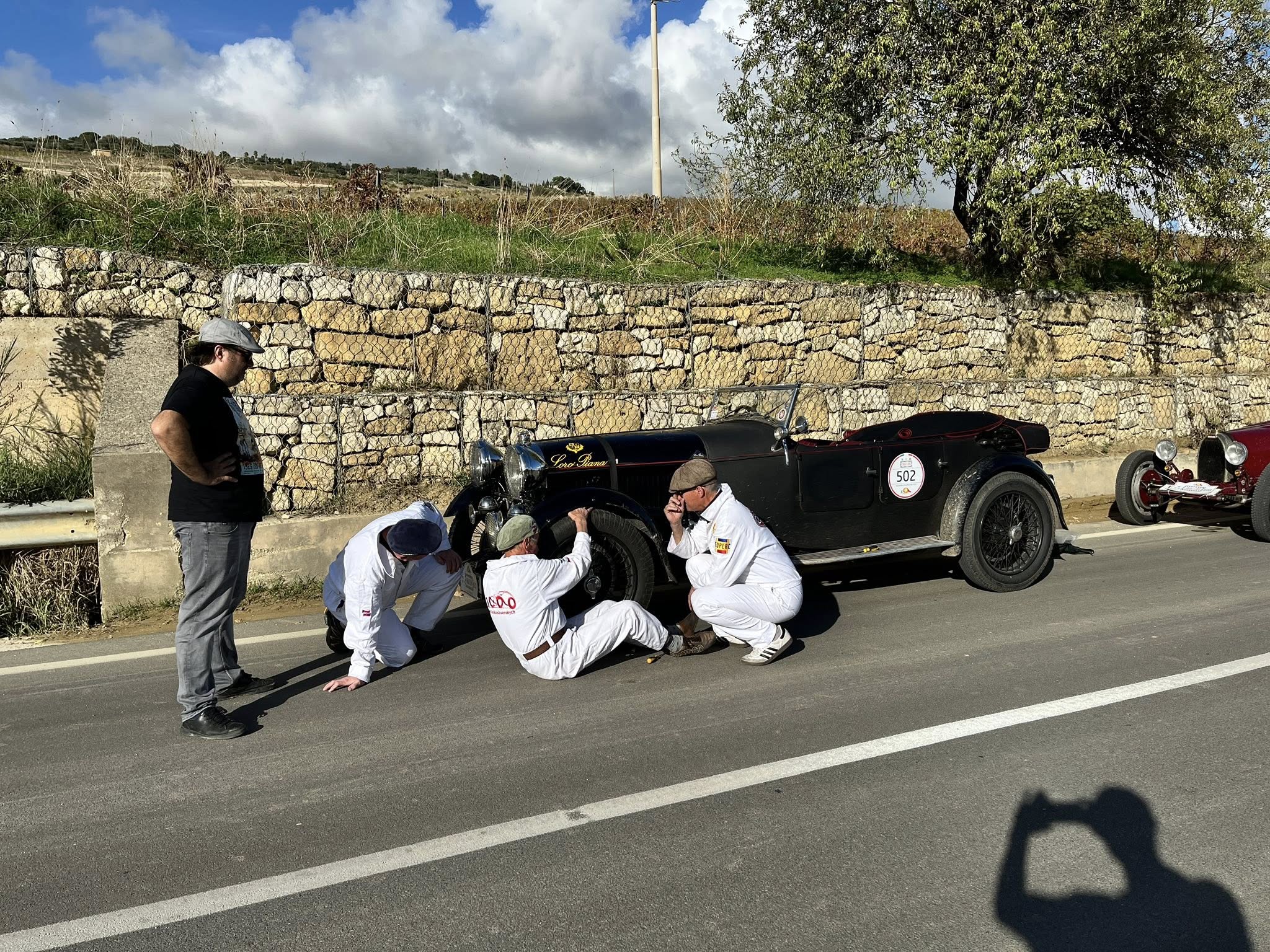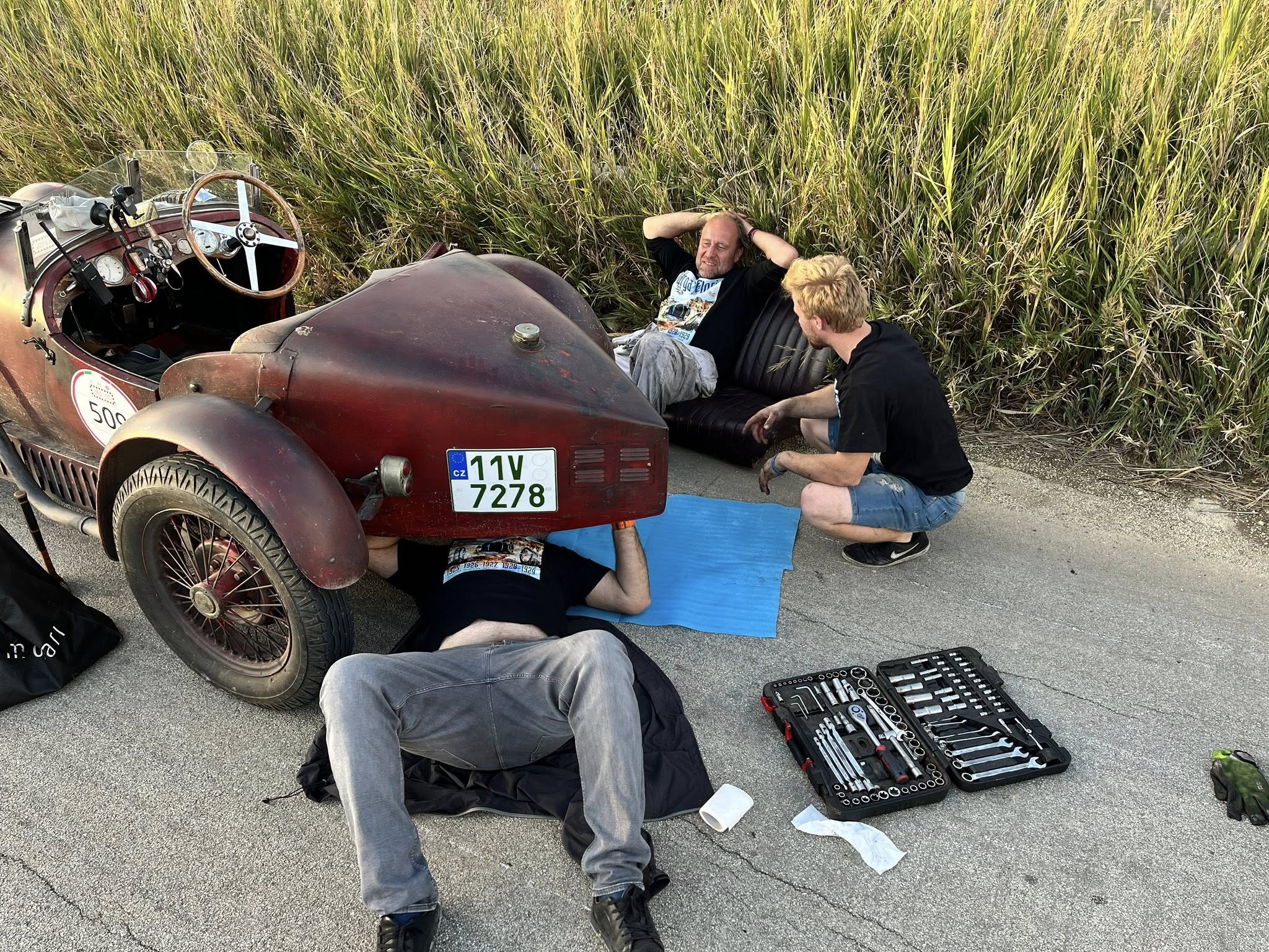 Nářadí do ruky, kapky deště v očích, hlína na rukávech — a motor znovu ožívá. Protože Targa Florio není o dokonalosti, ale o odhodlání dostat stroj do cíle, i kdyby to mělo stát pár škrábanců a hodně vůle.